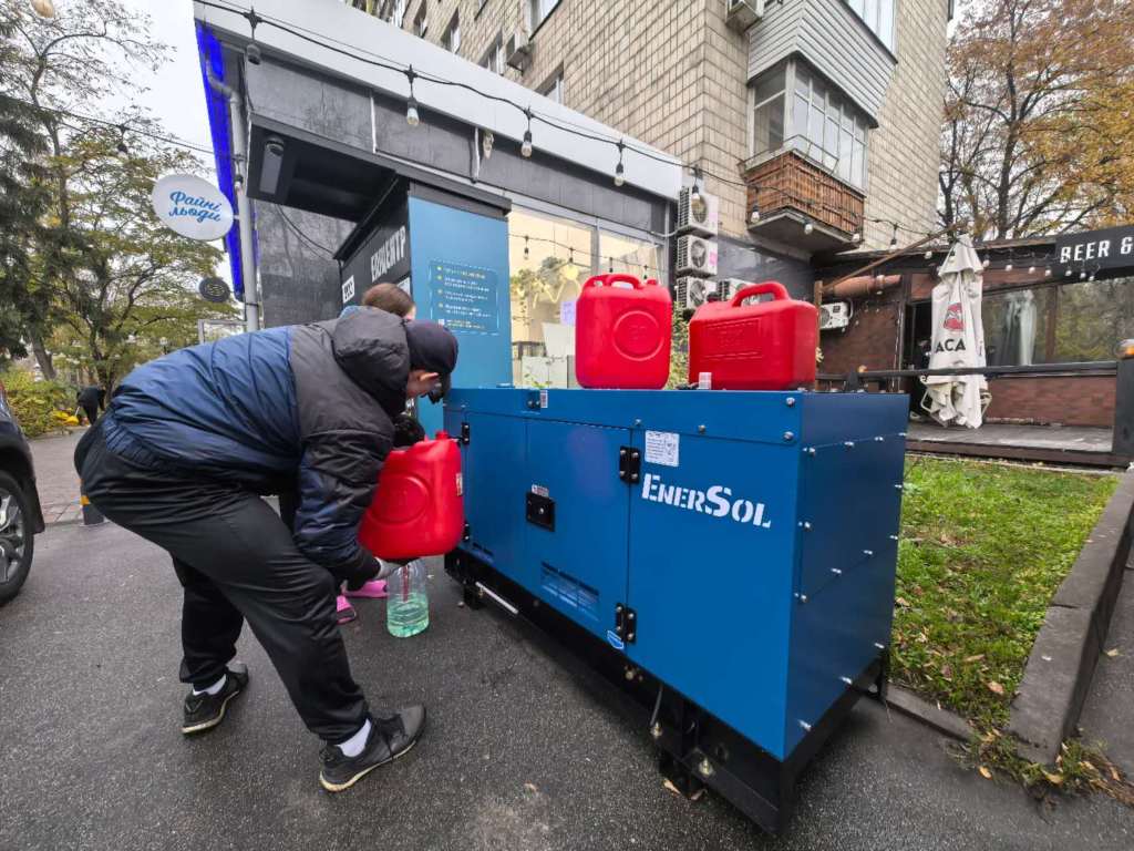 当地时间2025年11月10日,在乌克兰基辅,市民给发电机添加油料。新华社记者 李东旭 摄