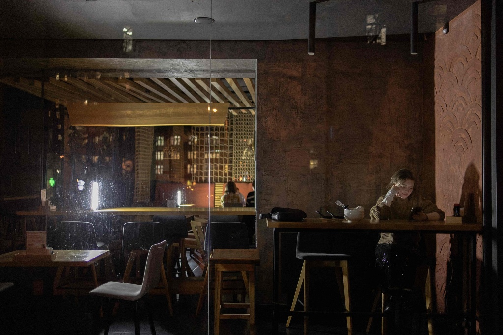 当地时间2025年11月26日,乌克兰基辅,俄罗斯导弹和无人机袭击乌克兰能源基础设施后,一名妇女在停电期间手持手电筒坐在一家餐馆里。视觉中国 图