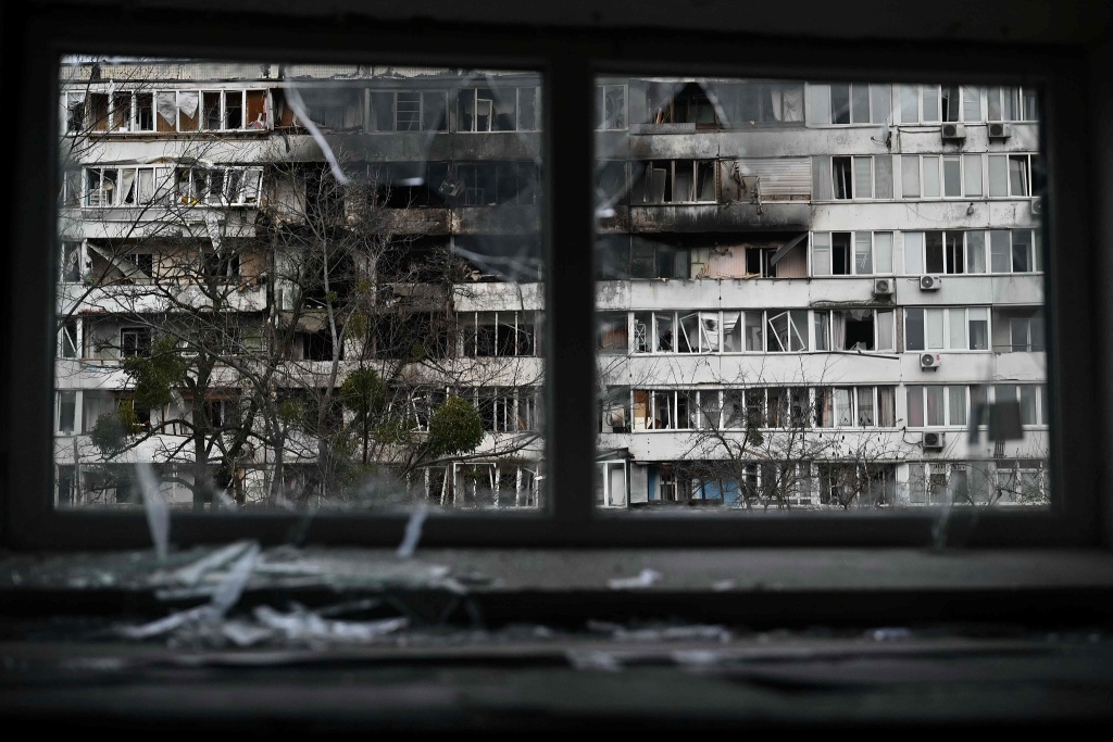 当地时间2025年11月25日,乌克兰基辅,透过一扇破损的窗户,可以看到一栋在空袭中受损的居民楼。视觉中国 图