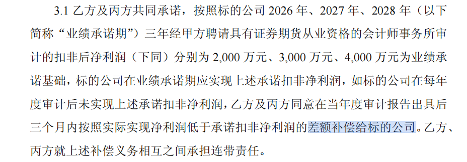 之所以能以高溢价收购,是因为业绩承诺条款成为平衡高溢价的关键。交易对方承诺,孚悦科技2026年、2027年、2028年经审计的扣非后净利润分别不低于2000万元、3000万元、4000万元,三年累计承诺净利润9000万元,年均复合增长率达50%。若未完成业绩承诺,交易对方将按差额进行现金补偿,补偿金额以本次交易对价为限。这一条款彰显了对于孚悦科技未来利润端的信心。