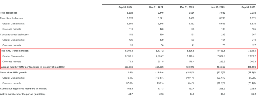 具体来看业务数据,第三季度,加盟茶饮店的净收入为28.116亿元,同比下滑14.8%,占公司总净收入的87.6%。财报指出,这主要归因于杯数的下降,导致大中华区市场总交易额(GMV)降低。销量下降的主要原因是,国内外卖平台为刺激客流量而加剧了补贴竞争。